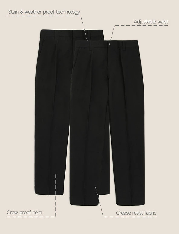 Freshen up their schoolwear with these two-pack trousers. Comfortable plus fit in a narrower slim leg style. Adjustable waist and hem allow for growth. Water-repellent Stormwear™ finish will keep them dry, while crease-resistant fabric ensures they’ll remain looking smart. Made with recycled polyester and sustainable viscose.