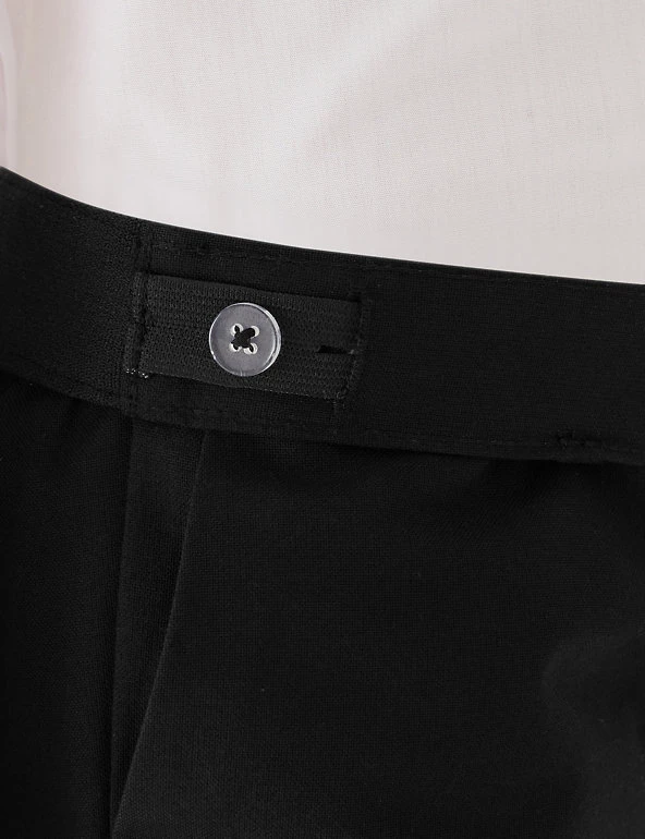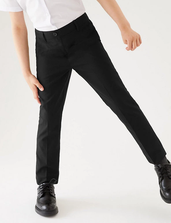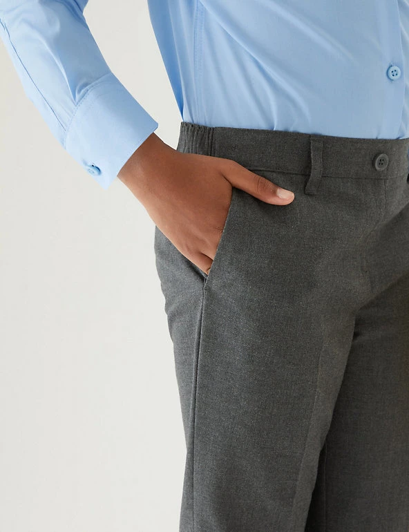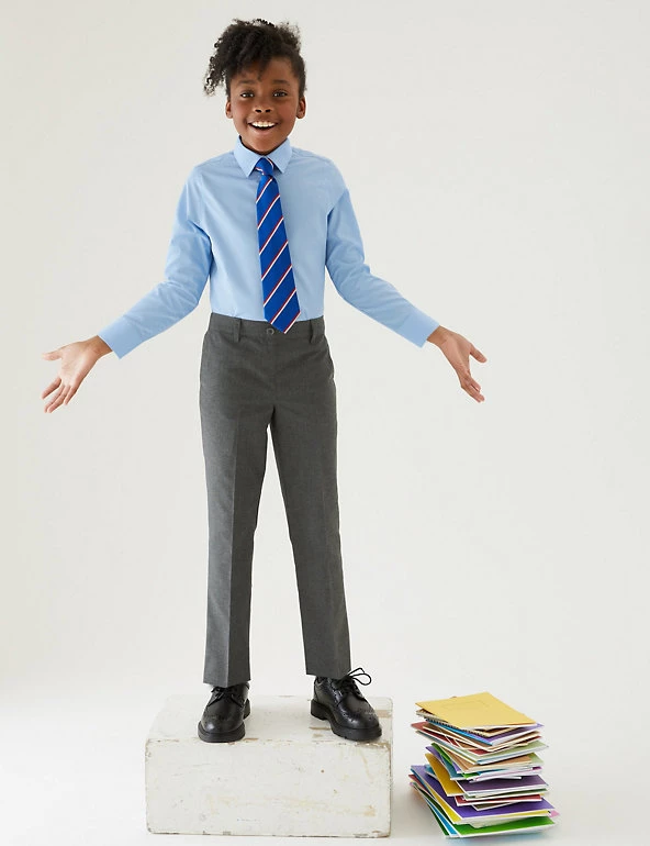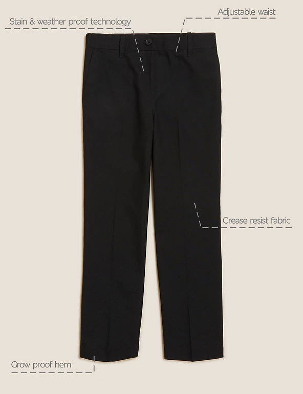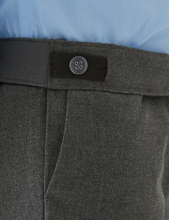 See them through the school week with this two-pack of trousers. Regular fit with a slim leg shape for a sharp look. As part of our Adaptive range, they have concealed labels and a pull-on waistband to make dressing a little easier. Crease-resistant fabric is also stain and weatherproof, so it keeps its looks whatever the day brings. Grow-proof hems and an adjustable waist mean these trousers will fit well through growth spurts. Made with recycled polyester and sustainable viscose.