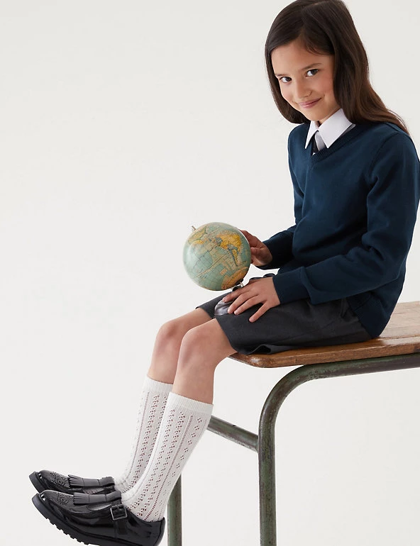 These pure cotton school jumpers will keep them looking smart from Monday to Friday. Slim fit is slightly narrower through the body and arms. Neat v-neckline. Our StayNew™ technology keeps their uniform looking newer for longer. We are transitioning this garment to organic cotton. While we transition, customers may receive items made with either sustainably sourced cotton or sustainably sourced organic cotton. We only ever use responsibly sourced cotton for our clothes.