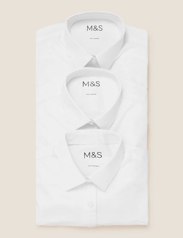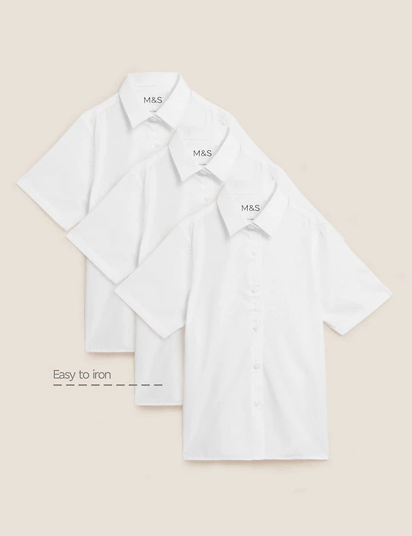 Make getting ready for school as stress-free as possible with our three pack of girls’ short-sleeved shirts. Regular fit for complete comfort. From our Adaptive range, they’re perfect for children with sensory issues or those who need a little help dressing, as we added riptape fastening behind the button placket and removed itchy internal labels. Thanks to the easy-to-iron finish, all they need is a quick press and they’re ready to wear. We are transitioning the polyester in this garment to recycled polyester. While we transition, customers may receive items made with either sustainable sourced cotton and recycled polyester or just sustainable sourced cotton and polyester.