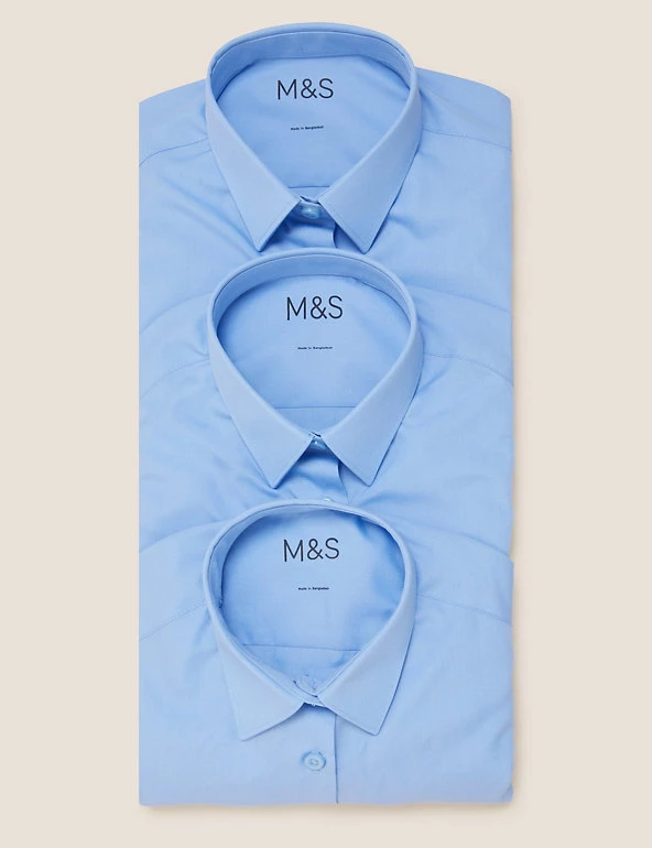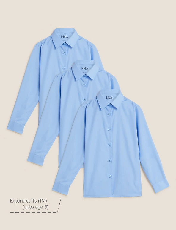 Our three pack of regular fit school shirts are the ultimate school time staple. Each shirt is designed with time saving Easy to Iron technology, a quick press and they are ready to go. For the younger sizes (up to 8 years), they come with our practical Expandicuff™ elastic in the cuff that makes it easier for children to dress and undress. We are transitioning the polyester in this garment to recycled polyester. While we transition, customers may receive items made with either sustainable sourced cotton and recycled polyester or just sustainable sourced cotton and polyester.