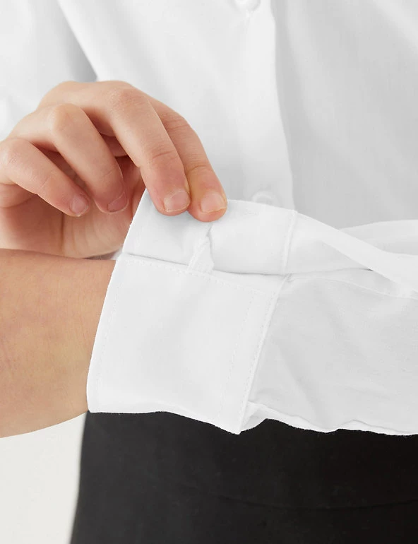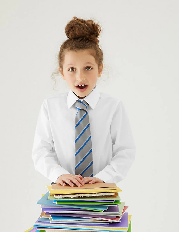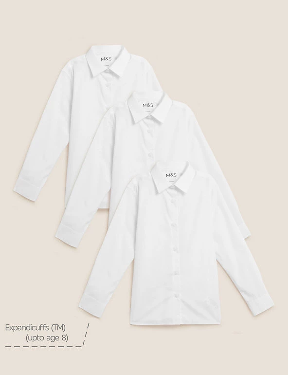 Featuring an easy-to iron finish, these long sleeve shirts look crisp after just a quick press – perfect when you’re in a morning rush. Pack of three, designed in a classic fit and available in a longer length for taller children. For sizes below 8 years elasticated expandable cuffs help make independent dressing quicker and simpler. We are transitioning the polyester in this garment to recycled polyester. While we transition, customers may receive items made with either sustainable sourced cotton and recycled polyester or just sustainable sourced cotton and polyester.