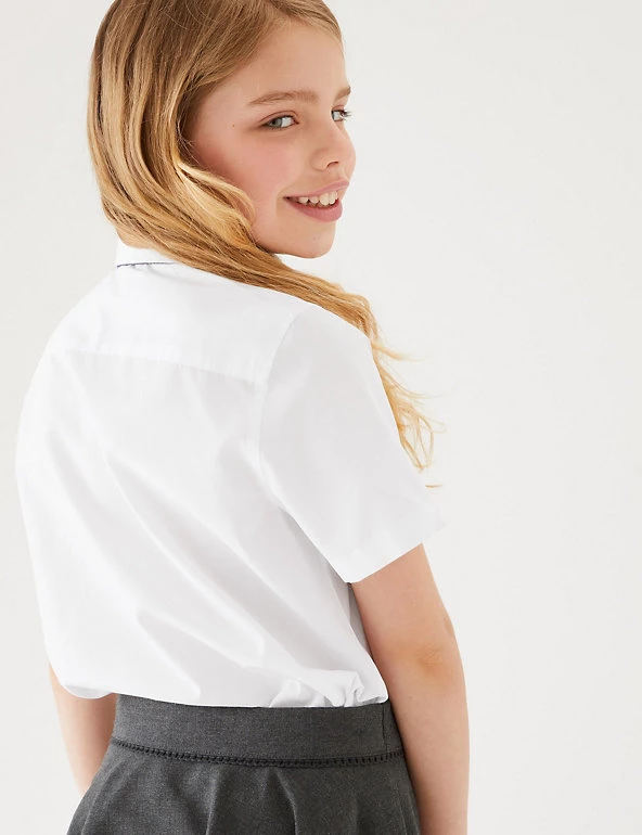 For classic, fuss-free school uniforms, look no further than our three pack of short sleeve shirts. Extra comfy plus fit which has more room through the body. Thanks to our easy-to-iron technology, these shirts only need a quick press to get rid of any creases. We are transitioning the polyester in this garment to recycled polyester. While we transition, customers may receive items made with either sustainable sourced cotton and recycled polyester or just sustainable sourced cotton and polyester.