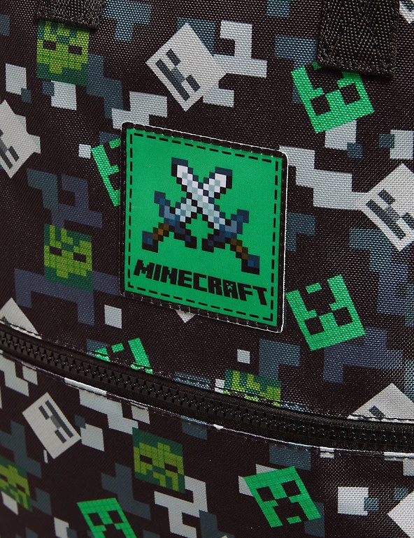 Add an extra dose of fun to their school day with this water repellent zip-up Minecraft™ backpack. Made with wide padded straps that are curved for a comfy fit against the body. This roomy backpack is big enough to fit A4 folders and features a side pocket for a water bottle, as well as a front zipped pocket and interior compartments for stationery. Extra padding in the back enhances comfort, while two top handles offer another way to carry it. Name and class label on the inside. Machine washable for easy cleaning.
