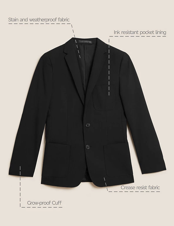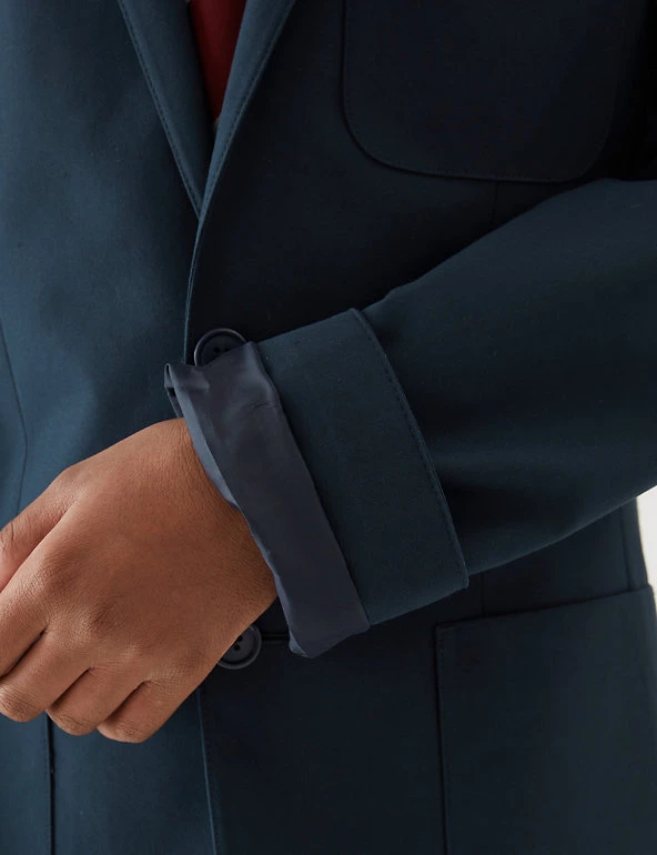 Our classic blazer has a stain and weatherproof finish, so it repels water and dirt and holds onto its smart looks for longer. Slim fit, for a modern outline. Ink resistant pockets help protect shirts from leaky pens. Crease resistant fabric stays neat and crisp throughout the day. Grow-proof cuffs can be unpicked and pressed for an extra 3cm sleeve length. Made with recycled polyester and sustainable viscose.