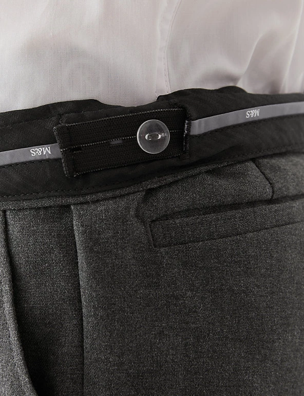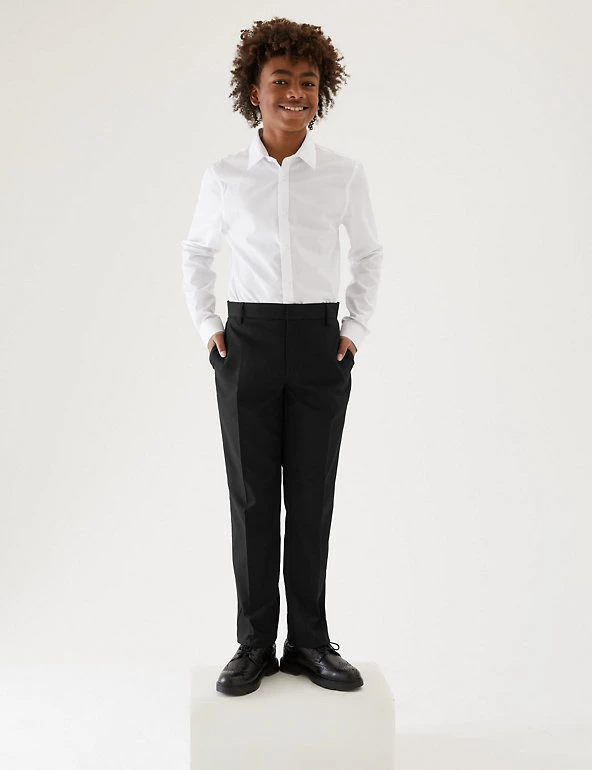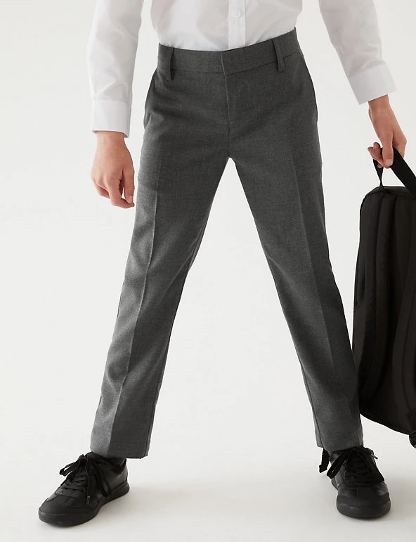 These school trousers will keep him looking smart from his first class to his last. Slim fit through the leg and added stretch for a modern, comfortable fit. An adjustable waist and grow-proof hems mean they’ll grow with him throughout the year. Thanks to the stain and weatherproof finish, rain and spillages will roll right off, while crease resistant technology keeps the fabric crisp all day. Made with recycled polyester and sustainable viscose.