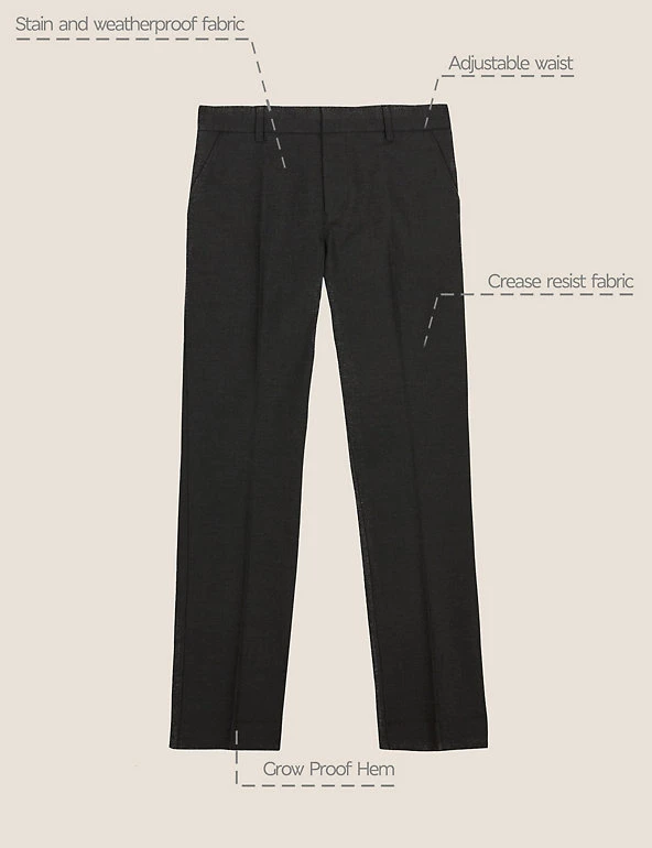 Flat waistband with zip and hook and bar fastening for-10-11+, Added stretch, Stain & weatherproof: a durable finish that repels water and stains , Our crease resistant technology stops clothes from creasing during wear, and ensures creases fall out more easily