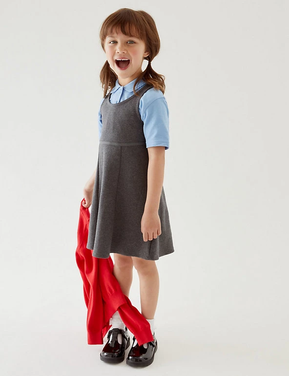 Add to kids’ everyday essentials with this pack of two cotton-rich pinafores. This sleeveless style layers easily over shirts or polos so they can wear it throughout the year. Complete with jersey panel detailing. Made with organic cotton. We only ever use responsibly sourced cotton for our clothes.
