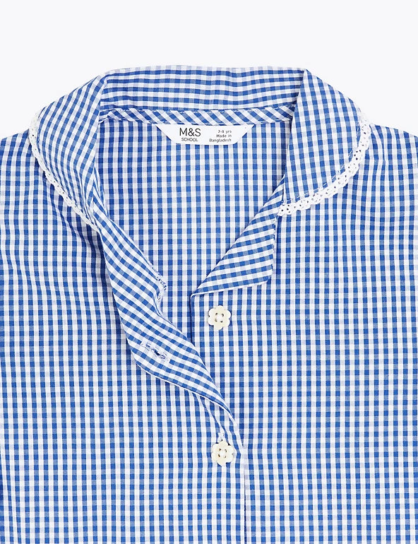 Our gingham school dress has been designed with comfort and style in mind. A timeless regular fit with three-button fastening at the front. Short sleeves with two handy pockets. Our easy-to-iron finish means it just needs a quick press and it’s good to go. We only ever use responsibly sourced cotton for our clothes.
