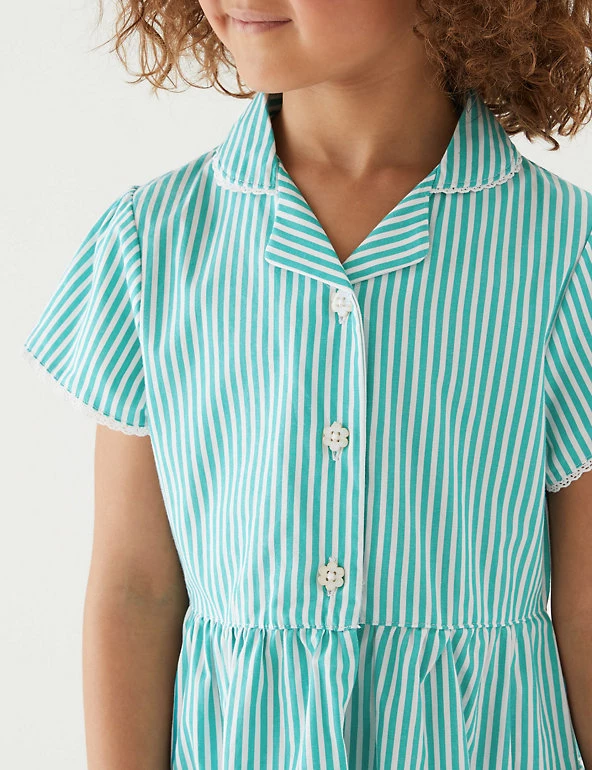 Our striped school dress has been designed with comfort and style in mind. A timeless regular fit with three-button fastening at the front. Short sleeves with two handy pockets. Our easy-to-iron finish means it just needs a quick press and it’s good to go.We only ever use responsibly sourced cotton for our clothes.