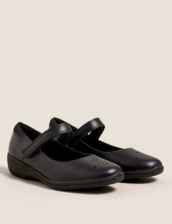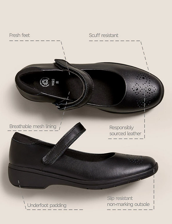 These durable leather school shoes are designed in a classic Mary Jane style, made with comfort in mind. Round toe design, with a quick and easy riptape strap and subtle floral detailing. A squidgy foam insole and soft collar padding keep feet comfy all day. Featuring low wedge heels with non-marking soles to protect your floors. Our antibacterial, odour-combatting Freshfeet™ technology keeps feet fresh. These shoes are complete with a recycled lining and sock, plus a scuff-resistant coating to keep them looking newer for longer. Made with sustainably sourced leather.