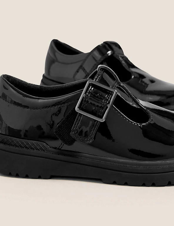 These sturdy patent leather shoes are ideal for school. T-bar style, with an easy riptape fastening. Antibacterial Freshfeet™ technology keeps their feet fresh. Squidgy foam insoles and soft padding to the collar for ultimate comfort. Handy scuff-resistant finish and non-marking soles for indoor floors. Made with sustainably sourced leather.