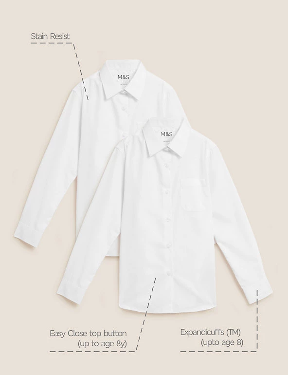 This two pack of stylish long sleeve school shirts is available in four different shades to meet any school uniform code. Featuring a regular fit and a smart button through style in a cotton blend, these school blouses are designed for comfort and practicality with a touch of style. Featuring Non Iron and Stain Resistant finishes, these shirts are easy to maintain, and an Easy Close top button and our patented Expandicuffâ„¢ (up to 8 years) makes dressing simpler for younger kids and provides long-lasting wear. We only ever use responsibly sourced cotton for our clothes.