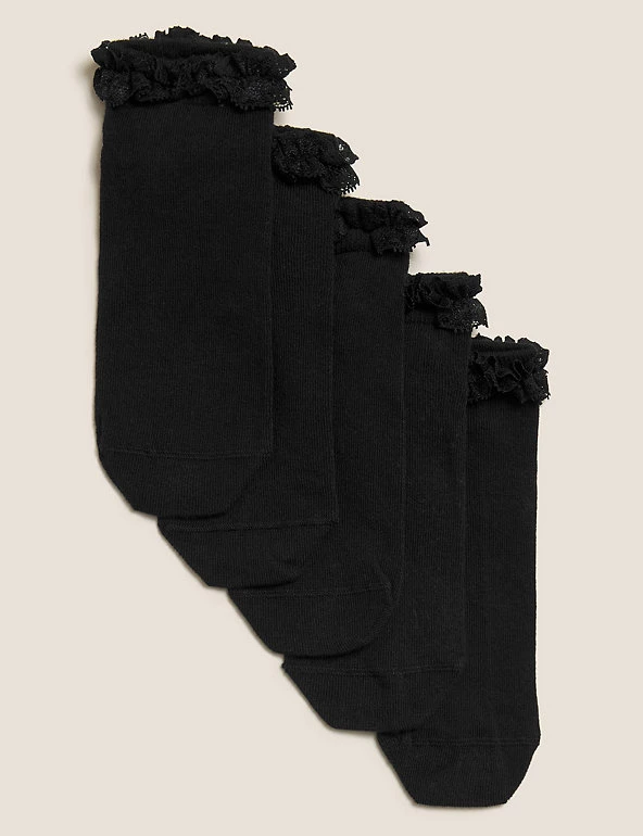 Adding a pretty finish to an everyday basic, this five pack of children’s trainer liners has an elegant lace trim that they’ll love to wear. Made from a wonderfully soft and breathable cotton mix complete with our Freshfeet™ finish, these children’s socks will keep their feet fresh and odour free throughout the day. We only ever use responsibly sourced cotton for our clothes.